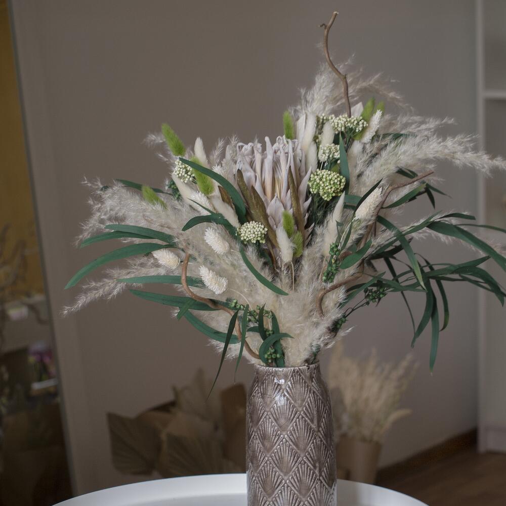 Протея – 1 шт.Ваза – 1 шт.кортадерия – 1 шт.Лагурус – 20 шт.стабилизированный эвкалипт ветка – 10 шт.
