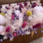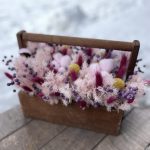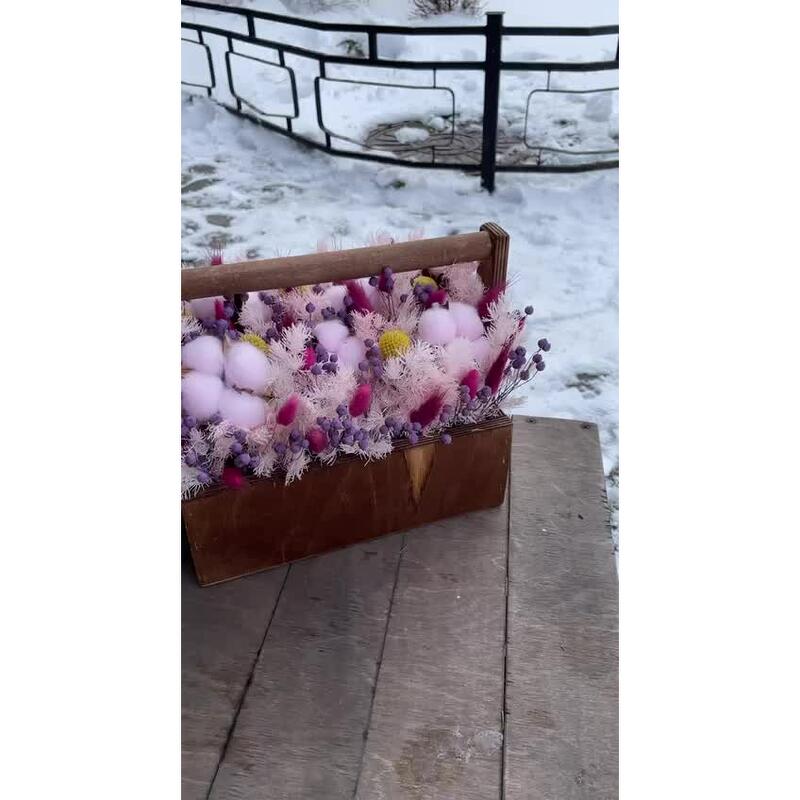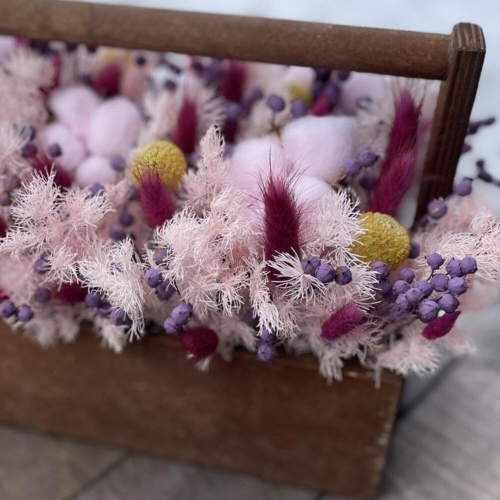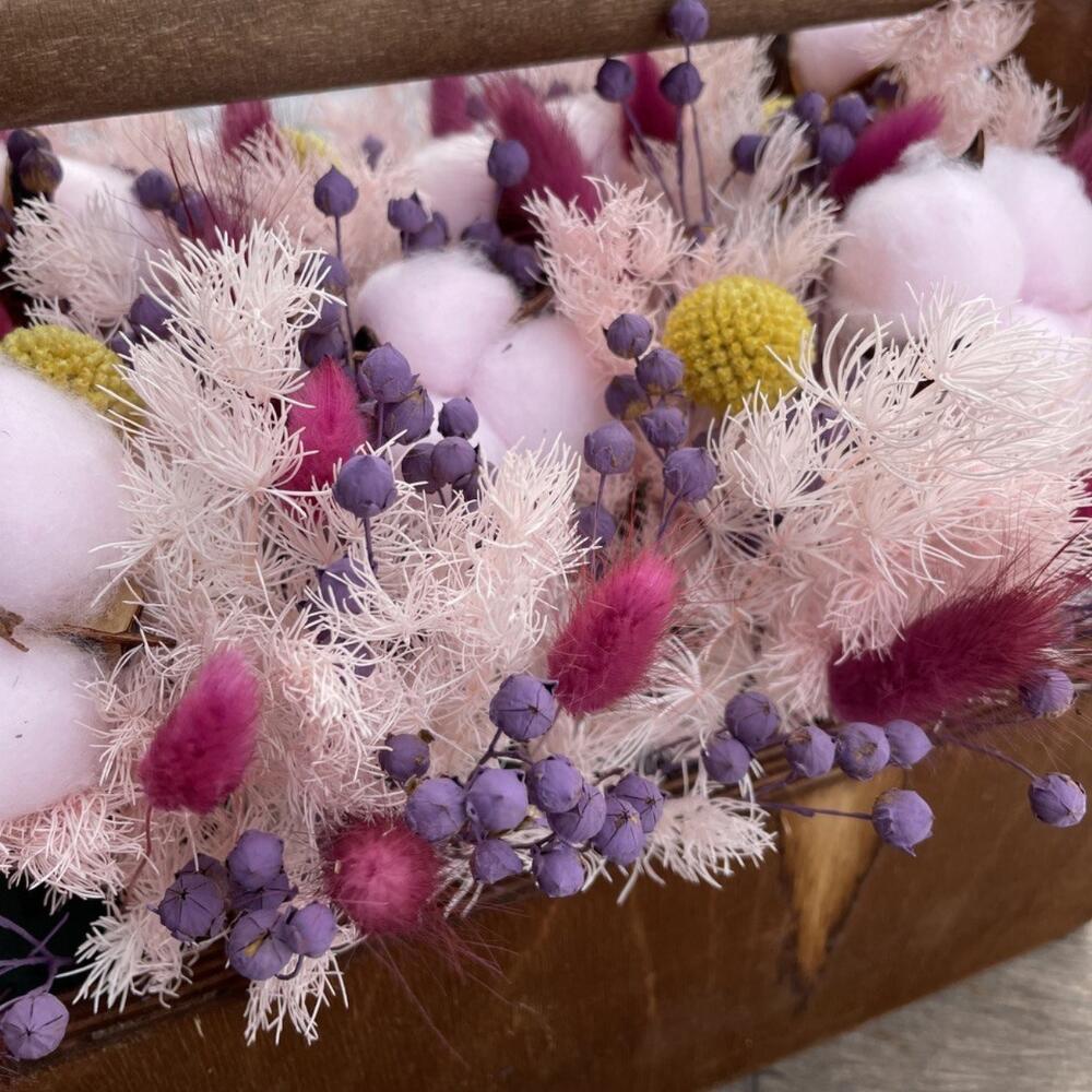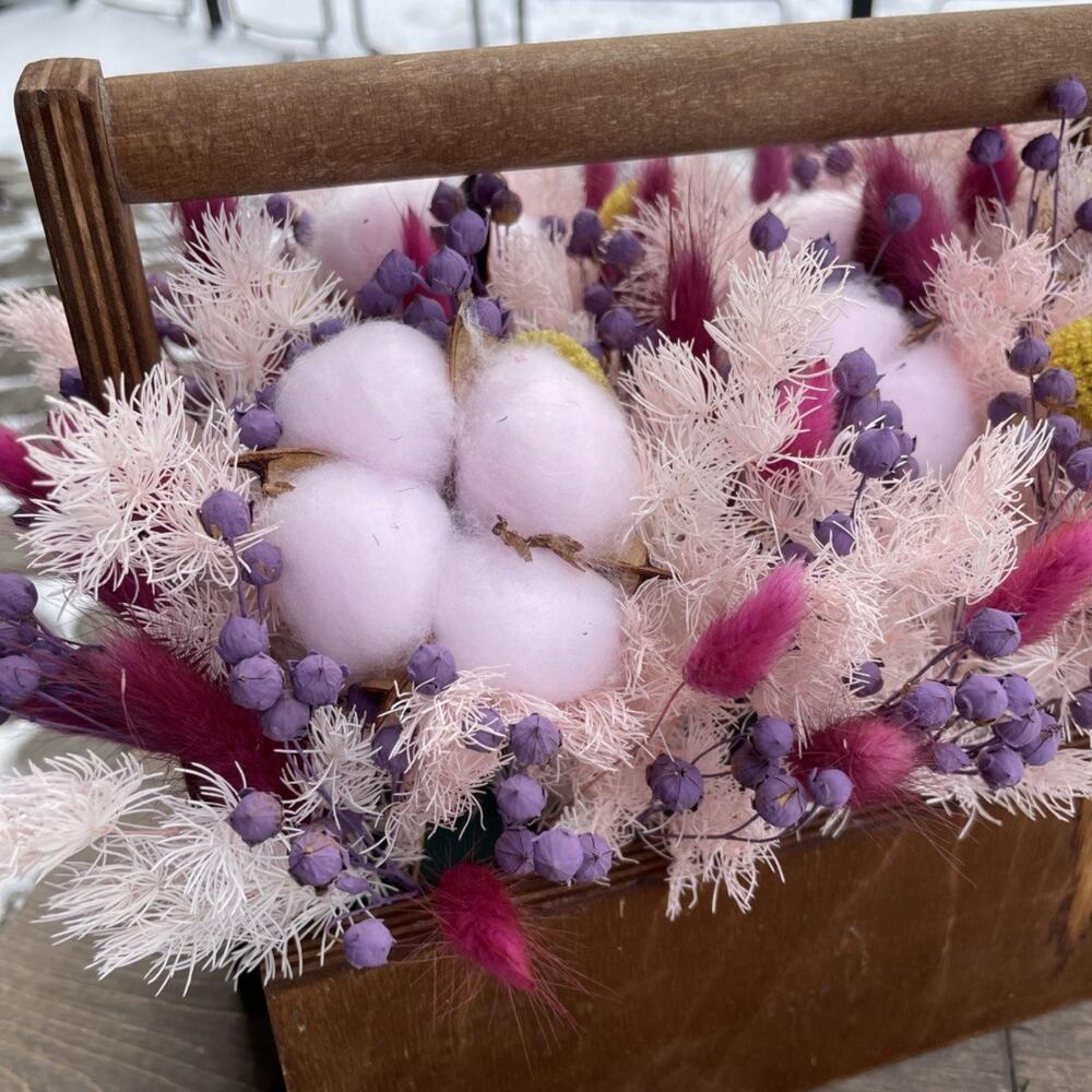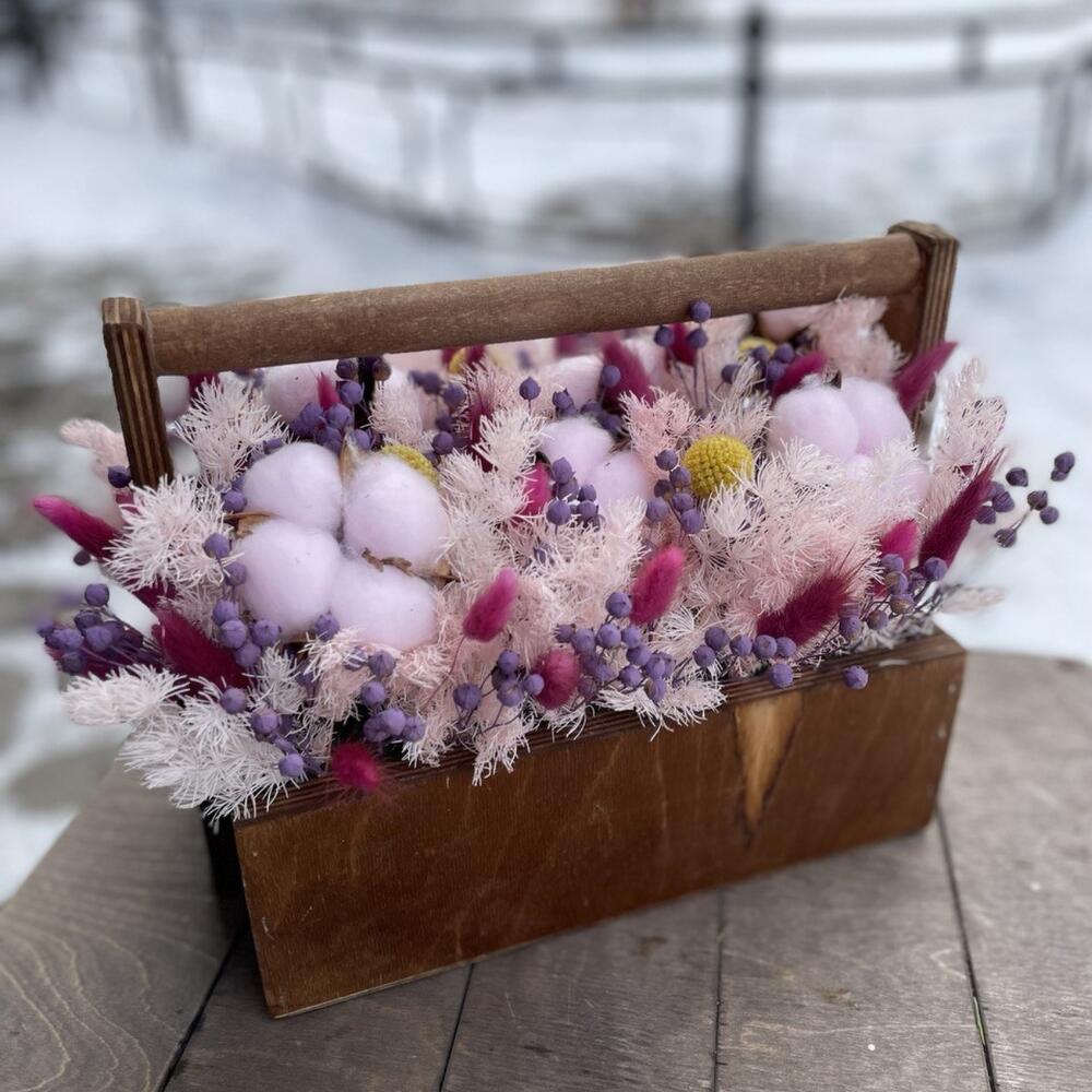 Хлопок – 6 шт.аспарагус стабилизированный – 3 шт.Краспедия – 5 шт.лëн – 10 шт.Лагурус – 20 шт.Ящик деревянный – 1 шт.Оазис флористический – 1 шт.