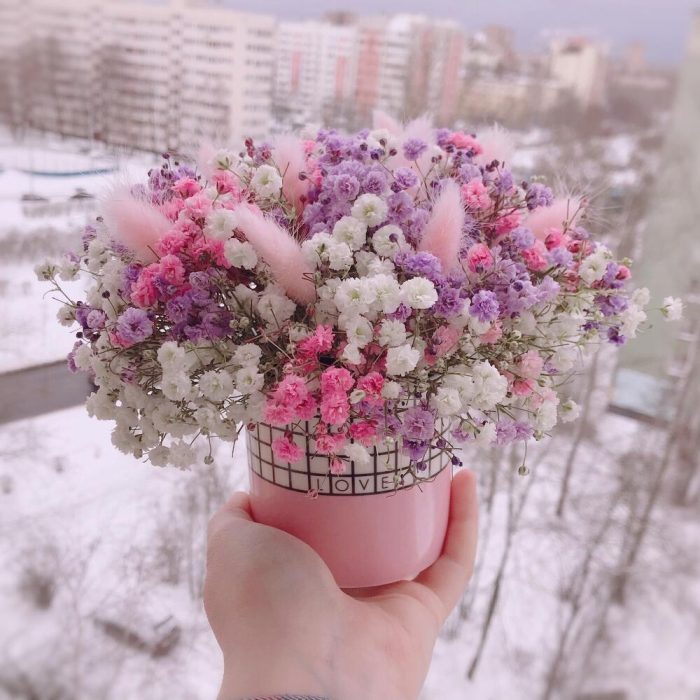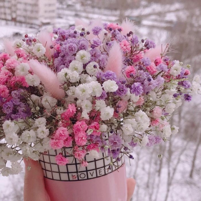 Очаровательная композиция из изысканных свежих цветов.Наполнена множеством соцветий радужной гипсофилы и пушистого лагуруса. Собрана в стильном кашпо из керамики с надписью “Love”.Композиция из гипсофилы – необычный подарок, который удивит своей невероятной стойкостью, при правильном и простом уходе.❤️ Ставить композицию в прохладном месте, избегая отопительных приборов и прямых солнечных лучей. ❤️ Подливать немного воды в серединку.Гипсофила не вянет, а становится сухоцветом, сохраняя свой вид. Поэтому композиция продолжит радовать ещё очень долго!Чтобы защитить готовый букет во время доставки от любых погодных условий, мы бережно его упаковываем