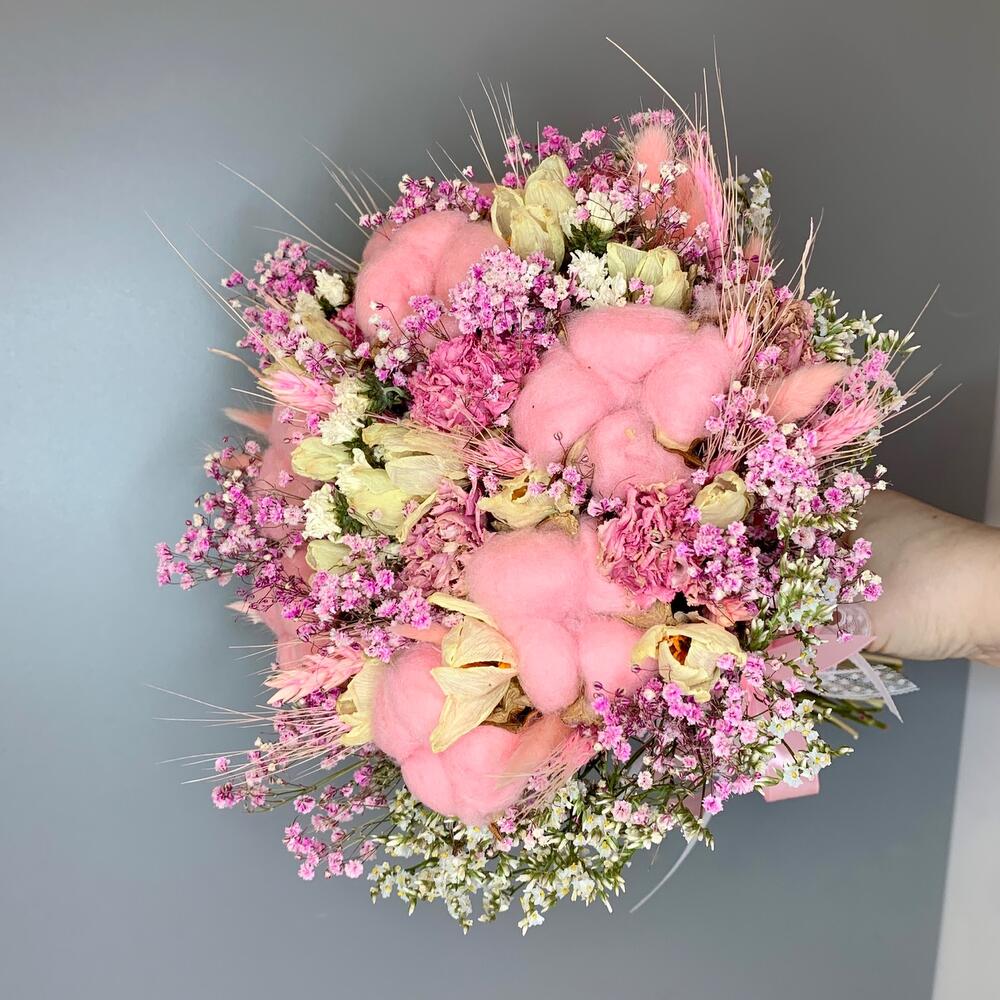 Хлопок – 7 шт.Лента атласная – 2 шт.Кружево – 2 шт.Сухоцветы – 30 шт.Лагурус (сухоцвет) – 12 шт.Тритикум(пшеница) – 14 шт.лимониум сухоцвет – 11 шт.гипсофила сухоцвет – 15 шт.