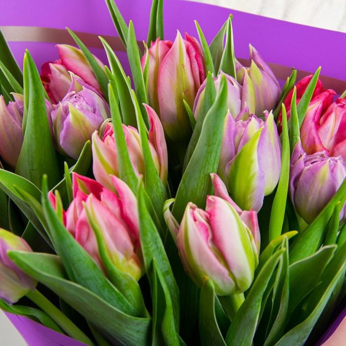 Букет из 15 тюльпанов пионовидных микс в дизайнерской упаковке