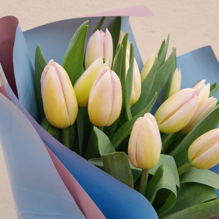 Тюльпан – 15 шт.Лента атласная – 2 шт.Упаковка дизайнерская – 3 шт.