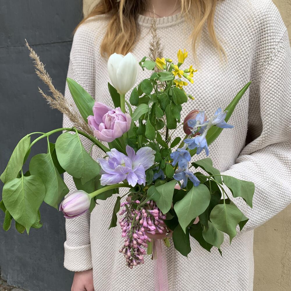 Анемон – 1 шт.Дельфиниум – 1 шт.Колосья – 2 шт.Тюльпан белый – 1 шт.полевая зелень – 1 шт.тюльпан катинка – 3 шт.